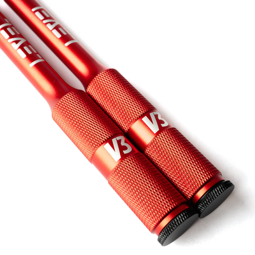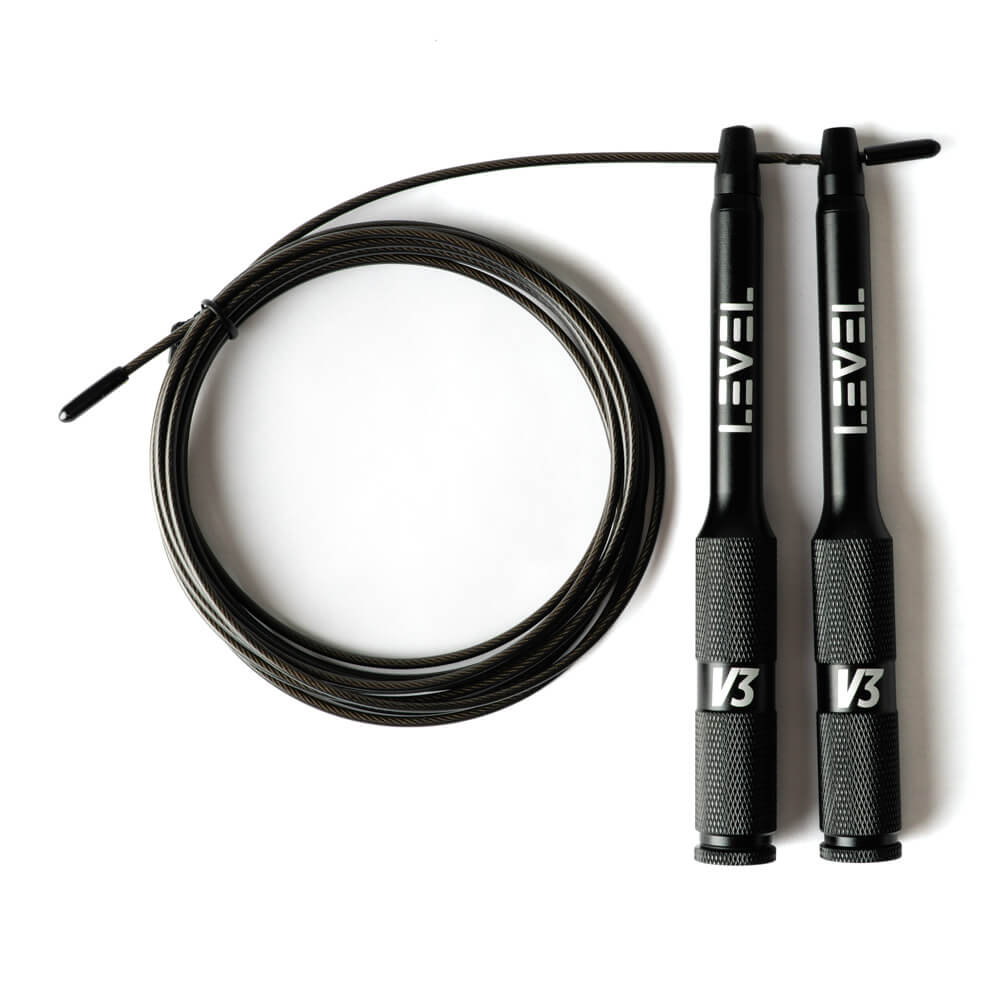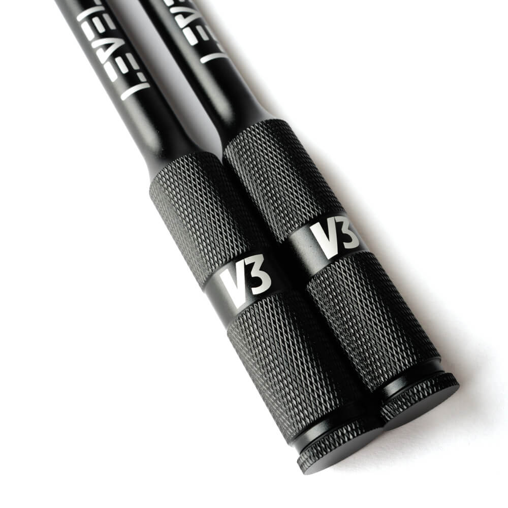 Levelin hyppynarussa on kestävät alumiiniset kahvat, joissa miellyttävä karhennus sekä loistavasti pyörivät laakerit. V3-malliin kahvoja on lyhennetty yhden sentin, jotta hyppiminen rasittaa vähemmän ranteita, mutta optimaalinen tuntuma säilyy. Hyppiminen on vaivatonta, eikä double underit eli tuplahypyt tunnu enää missään! Tällä narulla harjoitellaan jo triplahyppyjä.